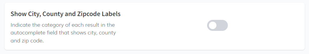Use the toggle button to enable or disable labels for city, county, and zipcode in the autocomplete field, which helps users identify the type of information they are entering.