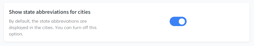 This toggle is enabled by default to display state abbreviations for cities. You can disable this option if you prefer not to show abbreviations.