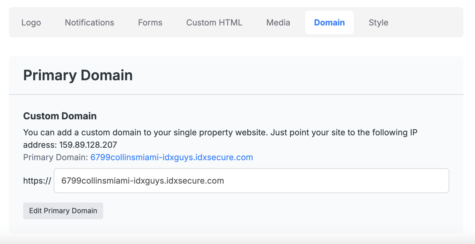 If you want to use a custom domain for your property website, go to the Domain tab. You'll need to point your domain to the given IP address. Once that’s set up, enter your domain in the field and click Add Primary Domain to complete the setup.