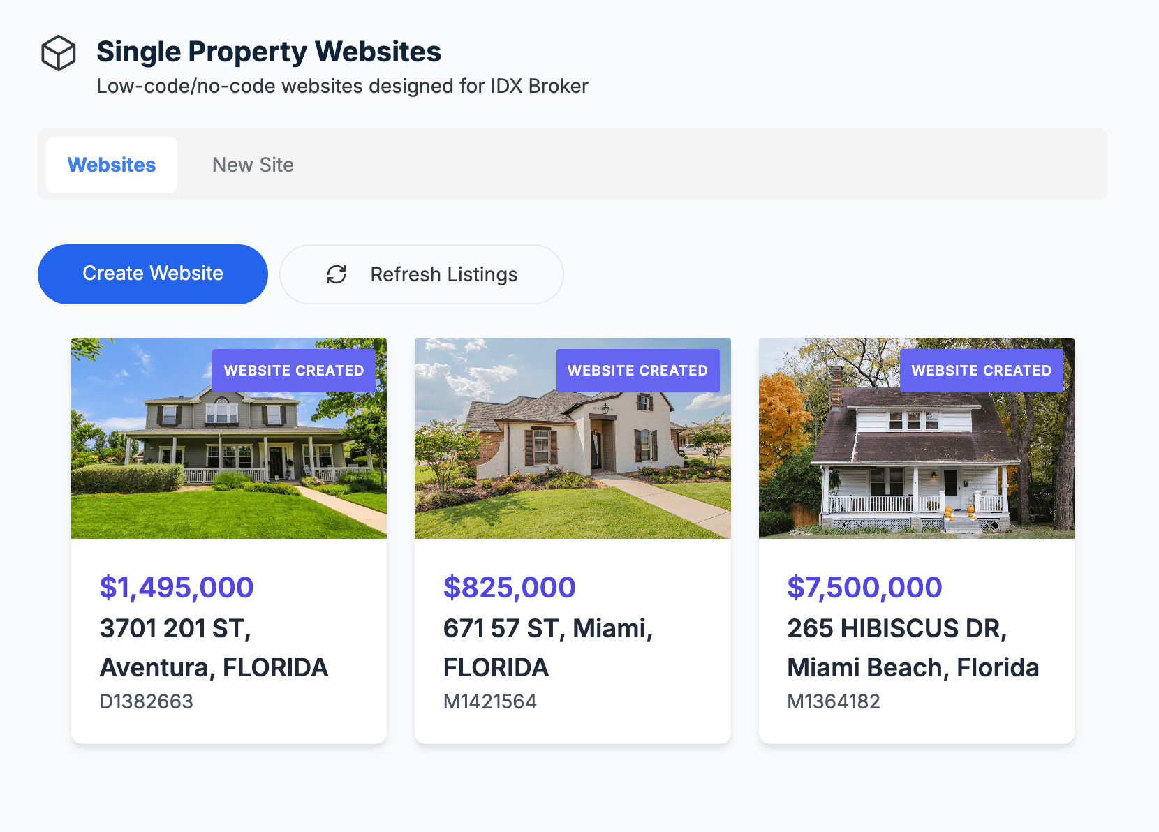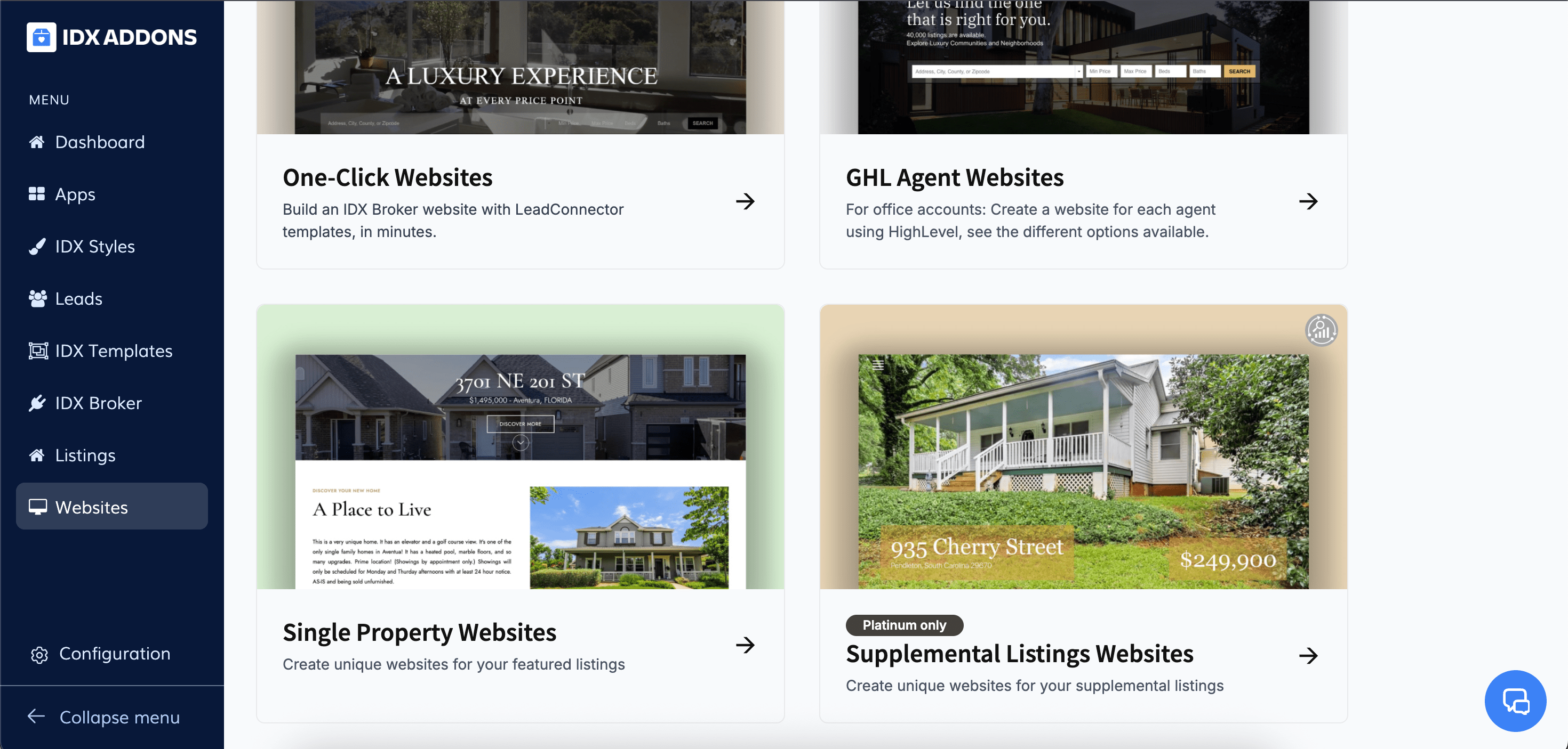 In the main menu, first select Websites and then Single Property Websites