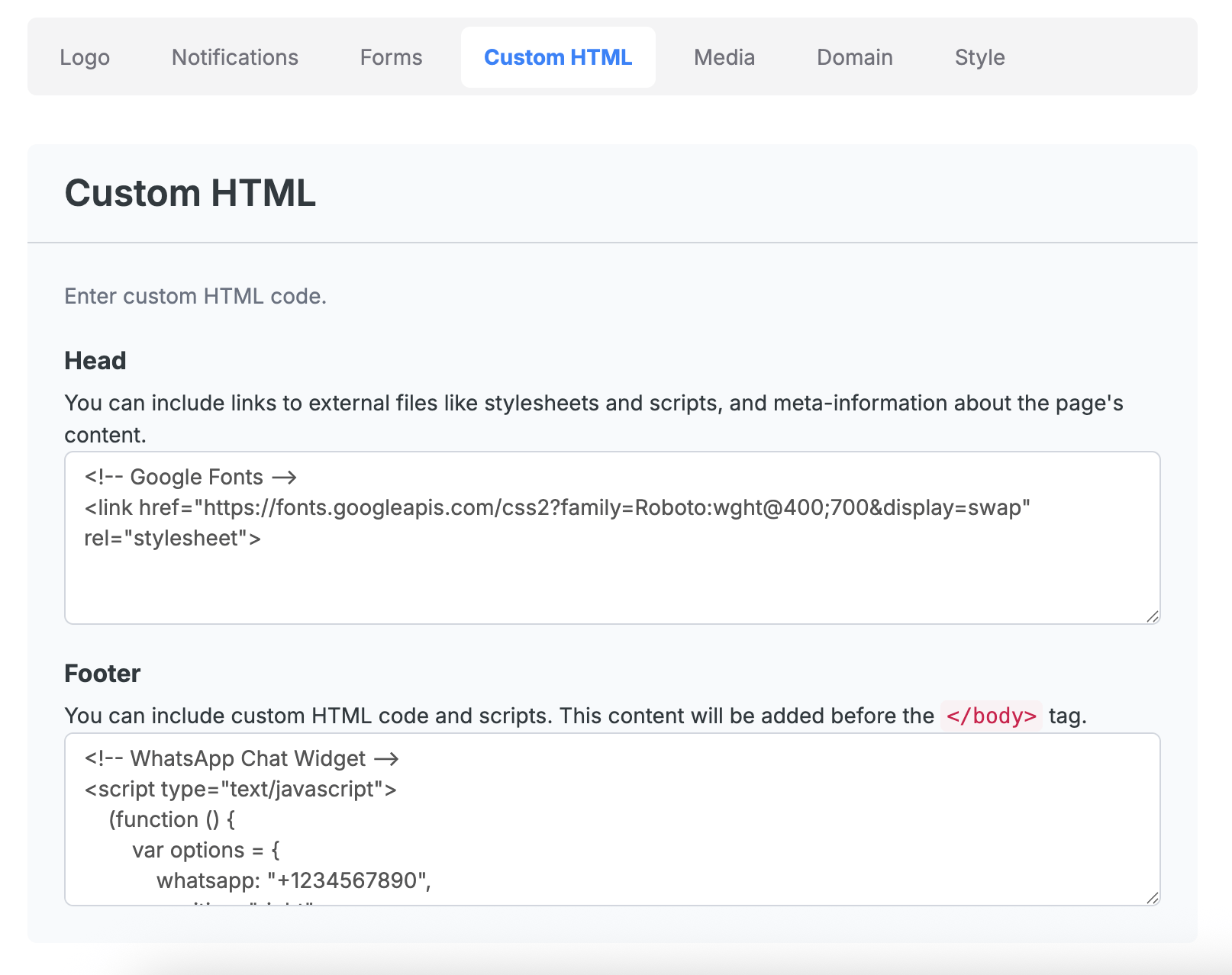 The Custom HTML section lets you insert additional code to extend your website's functionality. You’ll find two fields here: