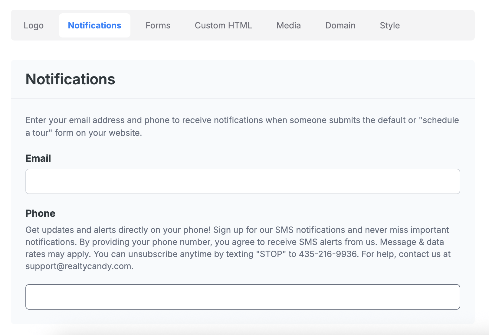 The Notifications tab allows you to set up alerts so you never miss an inquiry. Enter your email address to receive notifications when someone submits a contact or schedule form. You can also provide your phone number to receive SMS alerts directly to your device.