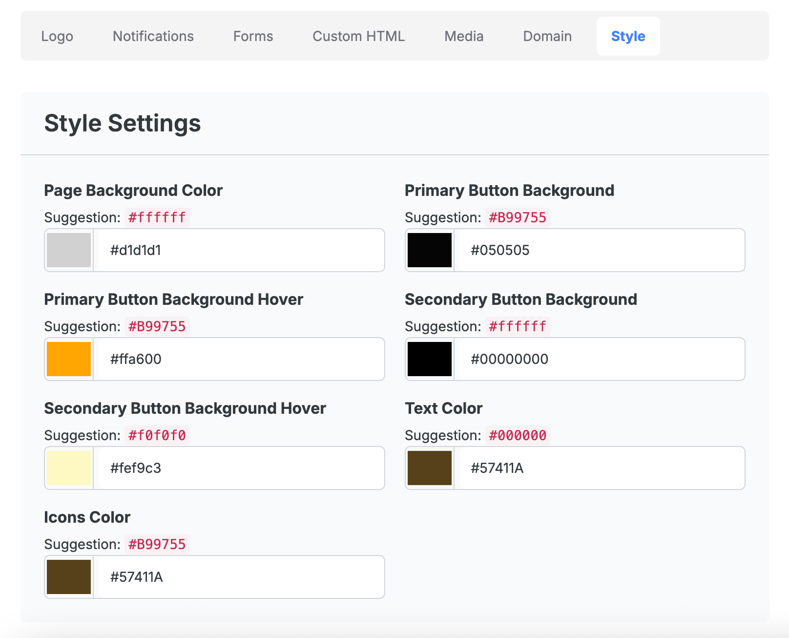 Update the color codes as needed to fully customize the look and feel of your site.
