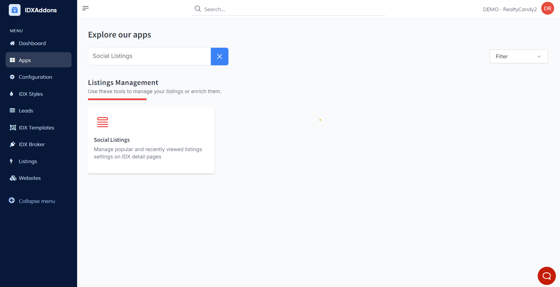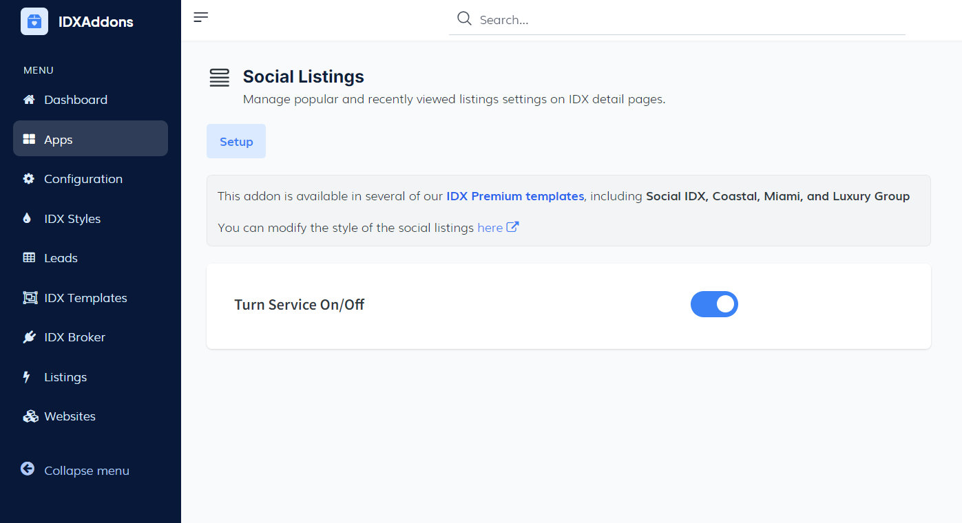 Upon entering the Social Listings app, you will find the Setup tab. This app is available in several IDX Premium templates, allowing for easy and effective integration.