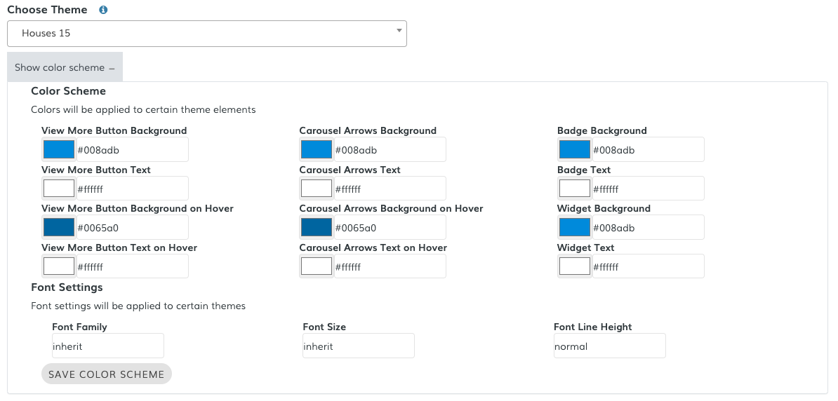 After selecting the theme, click on "Show color scheme" to display the available options. You can set the different colors, according to the selected theme. Notice that only some colors will be applied to certain elements, depending on the selected theme. Once you're happy with your selection, click on "Save Color Scheme".