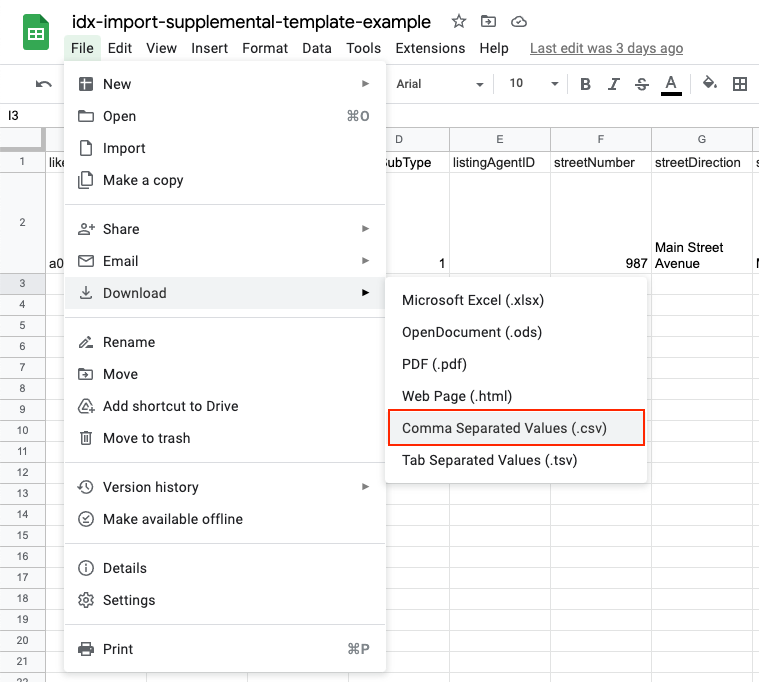 Click on Import From CSV to open a modal. Inside the modal, you will find the option Download this template CSV file. Download the template to ensure your file follows the correct format for importing supplemental listings. For this example, we are using Google Drive Documents.