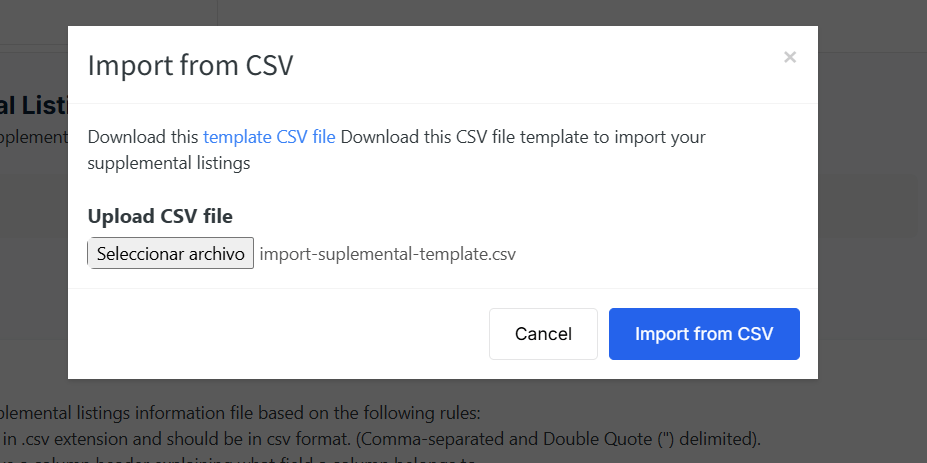 Once the file is ready and has the required information, click on Import From CSV. The system will process your file and add the supplemental listings.