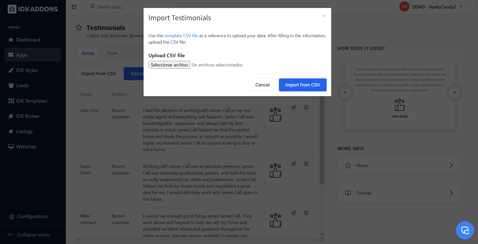 Import Testimonials from a CSV File- Click the "Import CSV" button.