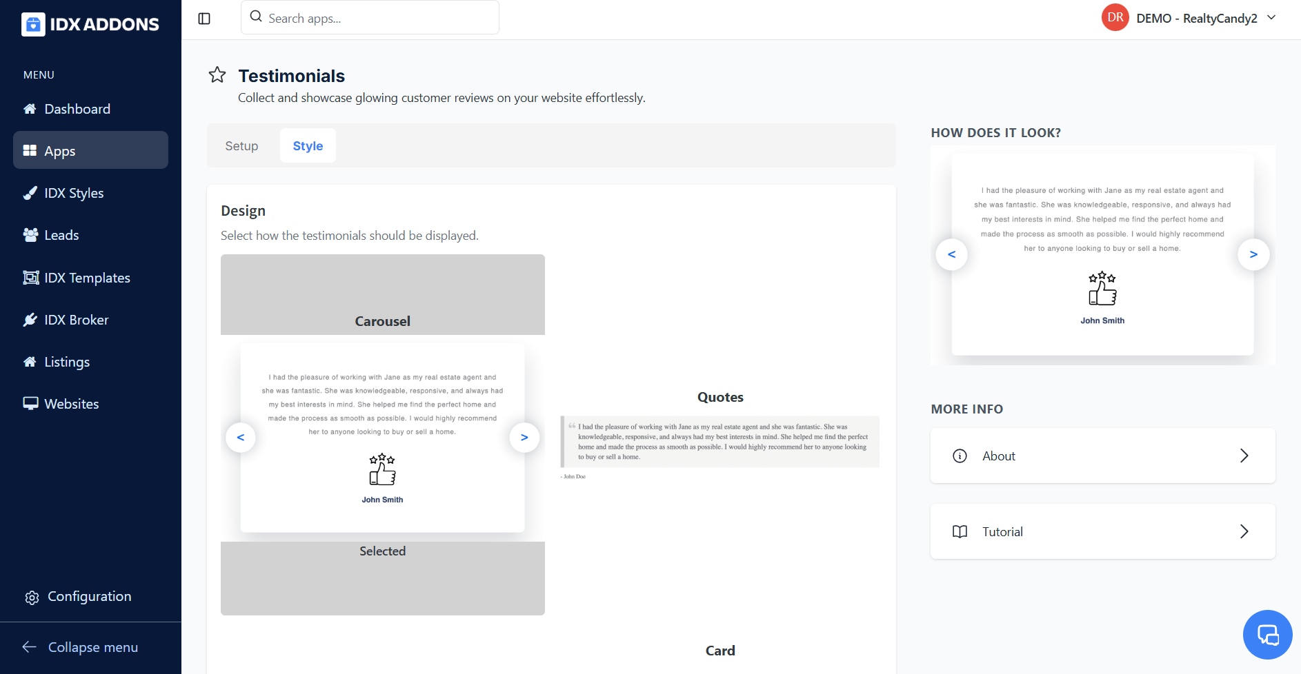 Customize how testimonials appear on your website. Choose from five different styles and select the one that best suits your needs.